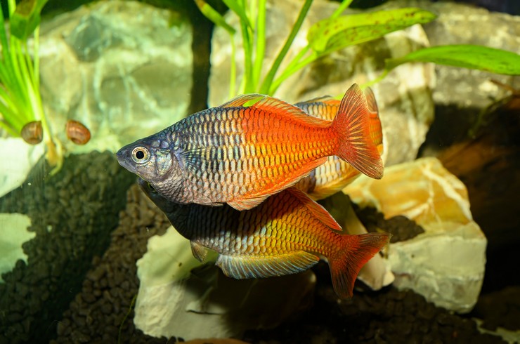Можно содержать радужниц и с донными рыбками: боциями, коридорасами, анциструсами, торакатумами. Из креветок подойдут только крупные виды: амано, фильтраторы.