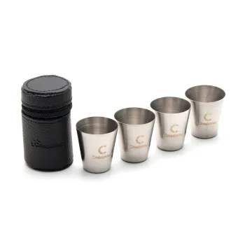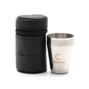 В наборе четыре стаканчика из нержавеющей стали объемом 20 мл. Такой комплект не разобьется даже в суровых походных условиях. Стаканчики из нержавейки - это гарантированно долгий срок службы и простота ухода, достаточно ополоснуть их водой и высушить. Каждая рюмка имеет «рубашку» из искусственной кожи для комфортного использования даже в морозное зимнее время. На оплёте и чехле эффектная прошивка широкой ниткой и логотип компании "Следопыт".