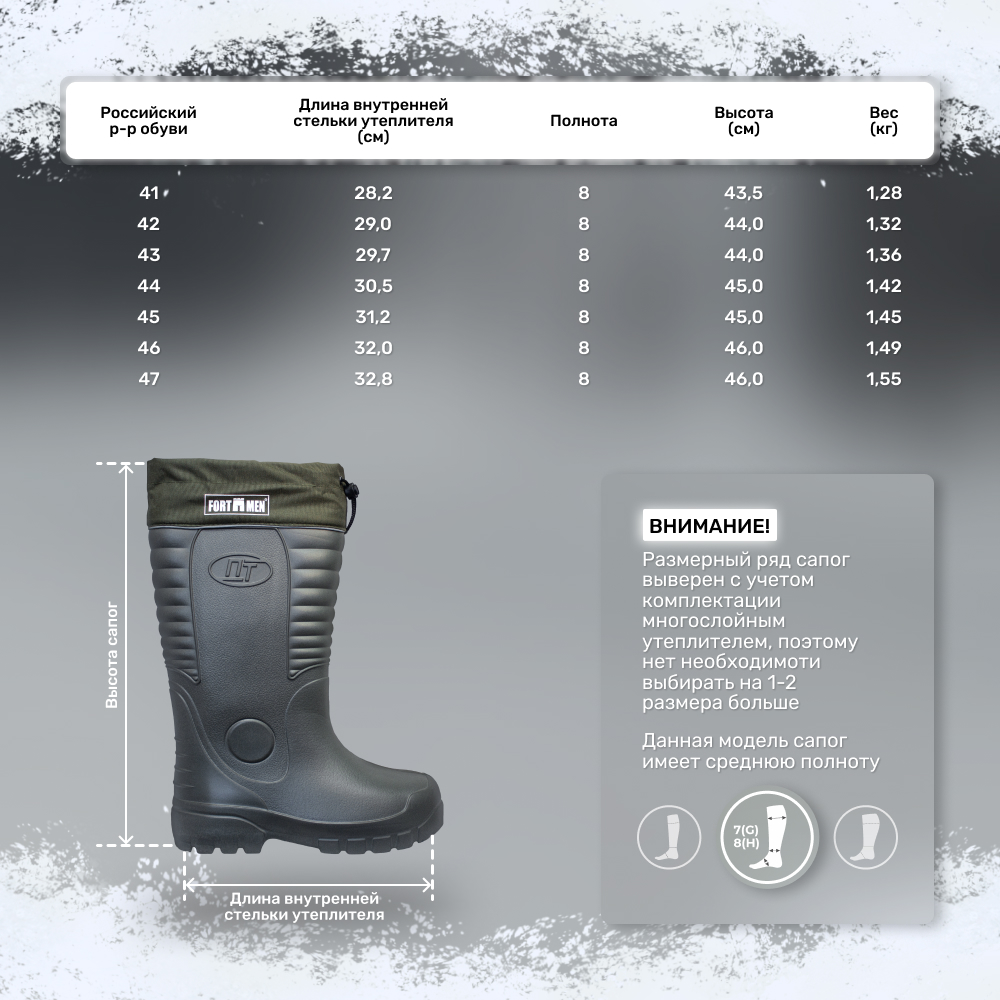 Главная Каталог Туристические товары Одежда, обувь Сапоги мужские FortMen ЭВА "Ермак" (-40С) 47р (черный)