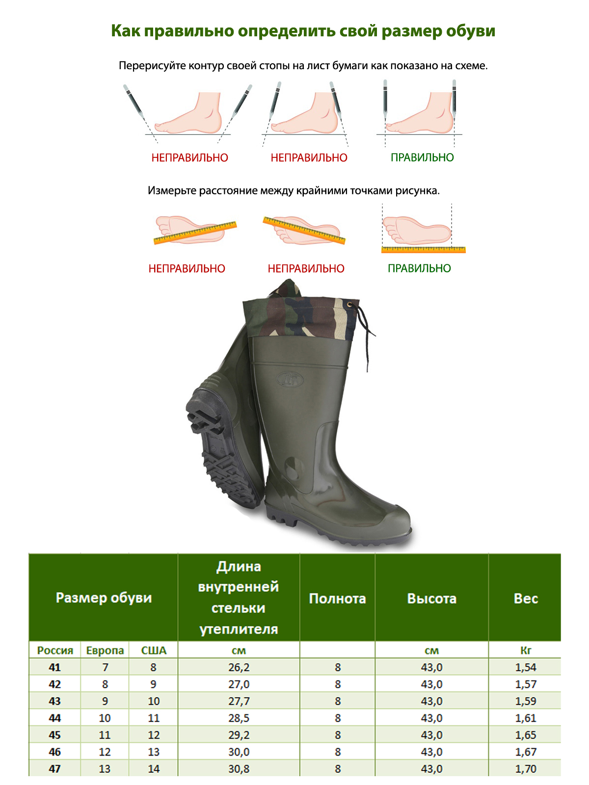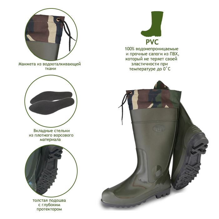 Резиновые сапоги с удобной формой и широким подъемом, высотой голенища 43 см. Резиновые сапоги с манжетой из водоотталкивающей ткани с утягивающимися завязками, препятствуют попаданию внутрь мелкого мусора и влаги. Сапоги резиновые изготавливается литьевым способом из высококачественного пластиката ПВХ. Благодаря своей высоте и наличию камуфляжной манжеты представленные резиновые сапоги наиболее популярны среди любителей охоты.