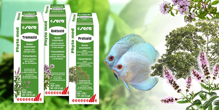 Растительное кондиционер воды sera Phyto med Бактацид в качестве действующего вещества для борьбы с бактериальными покраснениями кожи, вызванных бактериями Aeromonas, Pseudomonas или Vibrio, а также плавниковой и жаберной гнилью у декоративных рыб в пресноводных аквариумах и садовых прудах содержит высокоэффективное тимьяновое масло, полученное из Thymus vulgaris L., Thymus zygis L.