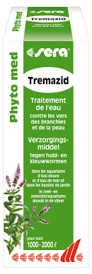 Растительное кондиционер воды sera Phyto med Тремацид в качестве действующего вещества для борьбы с жаберными и кожными сосальщиками в пресноводных и морских аквариумах, а также в садовых прудах содержит высокоэффективное и натуральное масло перечной мяты. Синтетические активные вещества, такие как хлорсодержащие вещества, в состав средства не входят.