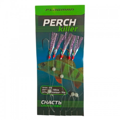 Снасть Flagman Perch Killer – готовая оснастка из стримеров, предназначенная для ловли окуня и жереха. Может с успехом применяться и в морской ловле. Оснастка Perch Killer полностью готова к использованию и представляет собой «ставку» из пяти стримеров, оснащенную с обеих сторон вертлюгами с застежками. Стримеры связаны с использованием голографической синтетики, как прямой, так и скрученной, в частности, Crystal Flash. Достаточно извлечь Flagman Perch Killer из упаковки, прикрепить ее к основной леске, а с другой стороны установить блесну, джиговую приманку, сбирулино, тирольскую палочку или грузило – и вперед, за полосатыми трофеями!