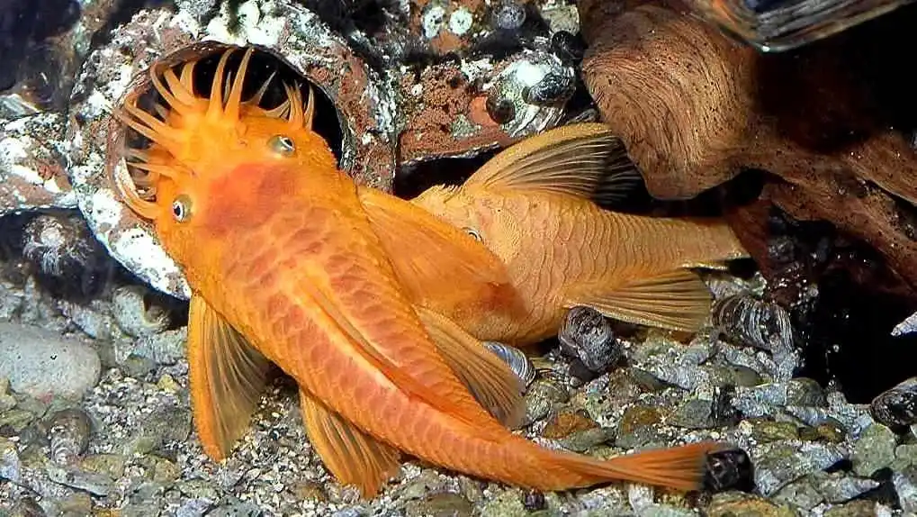 • Внешний вид: Тело приплюснутое, покрыто костными пластинками, как "броней". Рот в форме присоски с роговидными бугорками для соскребания водорослей. Взрослые особи обычно достигают размера 5-10 см, что делает их подходящими даже для небольших аквариумов. Существуют также вуалевые формы с длинными плавниками.