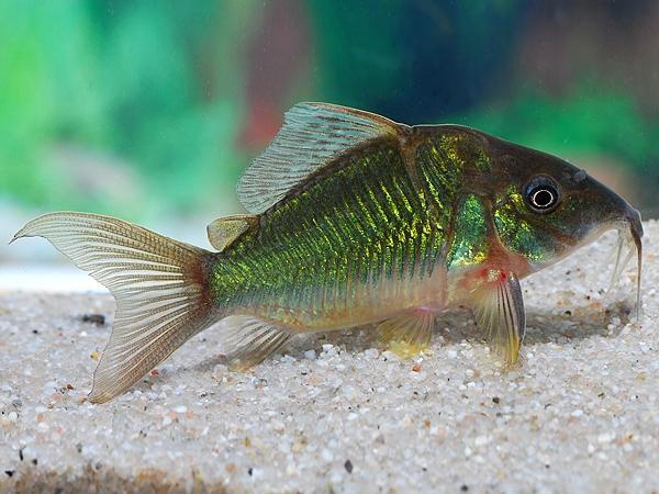 • Внешний вид: Эти сомики отличаются прочным телом и эффектным металлическим блеском, цвет которого варьируется от ярко-зеленого до сине-зеленого в зависимости от освещения. У них характерная округлая форма морды и усики вокруг рта, которые они используют для поиска пищи на дне.