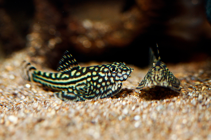 Инкубационный период точно не зафиксирован, после обнаружения мальков им предлагаются стартовая диета – инфузории, науплии артемии и т.п. По мере роста переходят на качественные сухие корма. По форме тела мальки отличаются от взрослых рыб: они не такие «плоские» и имеют небольшие усики. Грудные и брюшные плавники небольшие, это указывает на то, что молодые особи плохо держатся в течении, поэтому и предпочитают ползать в расщелинах. При достижении размера 5 мм мальков можно высаживать в общий аквариум, взрослые рыбки их уже не обидят.