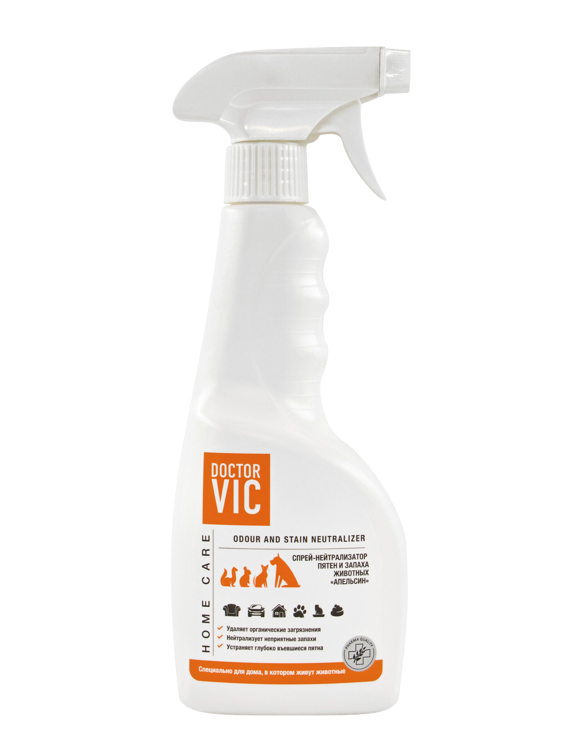 Doctor VIC (Доктор Вик) Спрей-нейтрализатор пятен и запаха животных «Апельсин» предназначен для нейтрализации неприятных запахов, удаления органических загрязнений (от кошачьих меток, мочи, фекалий, рвоты, крови, грязи, травы, пищи) с ковров, мебели, тканей, пола, спальных мест, клеток, туалетов животных, обивки автомобилей.