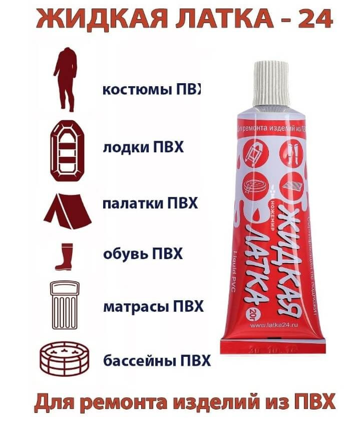 Жидкий ПВХ Латка 24 - это инновационное средство для ремонта изделий из ПВХ, неопрена и резины. Жидкая латка обладает целым рядом преимуществ: