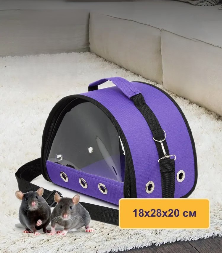 Удобная переноска имеет размер 18х28х20 см. Подходит для крыс, ёжиков, морских свинок, мышей и попугаев. Рекомендованный вес до 3 КГ. Выполнена из износостойкой ткани оксфорд. Есть мягкий съемный матрасик. Жесткий каркас не позволяет переноске складываться при её использовании. Подкладка изготовлена из флиса.