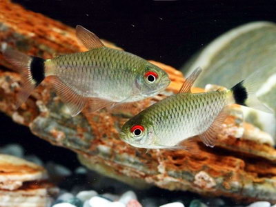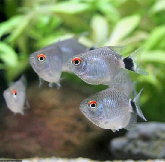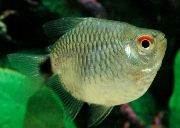• Внешний вид: Рыбка имеет вытянутое, высокое тело, сплющенное с боков, серебристого окраса. Главная отличительная особенность — ярко-красное пятно в верхней части глаза, а также характерное большое черное пятно у основания хвостового плавника с белой окантовкой.