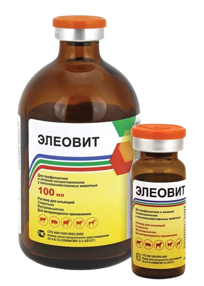 Дозы и способ применения: Препарат вводят животным внутримышечно или подкожно в следующих дозах на одно животное: Крупный рогатый скот — 5-6 мл Лошади — 3-5 мл Жеребята, телята — 2-3 мл Овцы, козы — 1-2 мл Ягнята — 1 мл Свиньи — 3-5 мл Поросята-отъемыши — 1,5 мл Ремонтный молодняк — 2 мл Поросята-сосуны — 1 мл Новорожденные поросята — 0,5 мл С профилактической целью элеовит применяют один раз в 2-3 недели, с лечебной целью — один раз в 7-15 дней. Супоросным свиноматкам элеовит вводят за 1,5-2 месяца до опороса, коровам за 3-4 месяца до отела. Одновременно с назначением препарата необходимо сбалансировать рационы по протеину, кальцию, фосфору, магнию и микроэлементам.