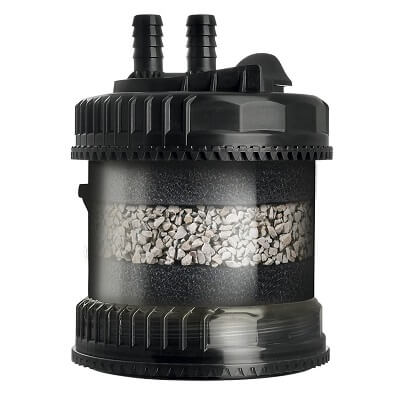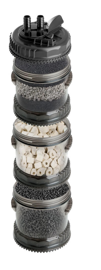 Количество фильтрующего материала увеличивается за счёт добавления модулей. Они наращиваются друг на друга с помощью резьбы. Подобное решение подходит для аквариумов с живородящими рыбами. При появлении мальков увеличивается биологическая нагрузка на систему.