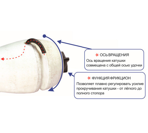• Ось вращения катушки совмещена с общей осью удочки.
